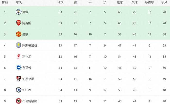 曼城最近两场赛果,让阿森纳原本6分的领先优势彻底化为乌有。曼城凭借进球数优势完成反超,两队目前净胜球同为37个,持平并列。曼城此前连续战平诺丁汉森林与西汉姆联,丢掉4个联赛积分;自此之后,球队已豪取英超三连胜,其中还包含客场击败切尔西的关键胜仗。