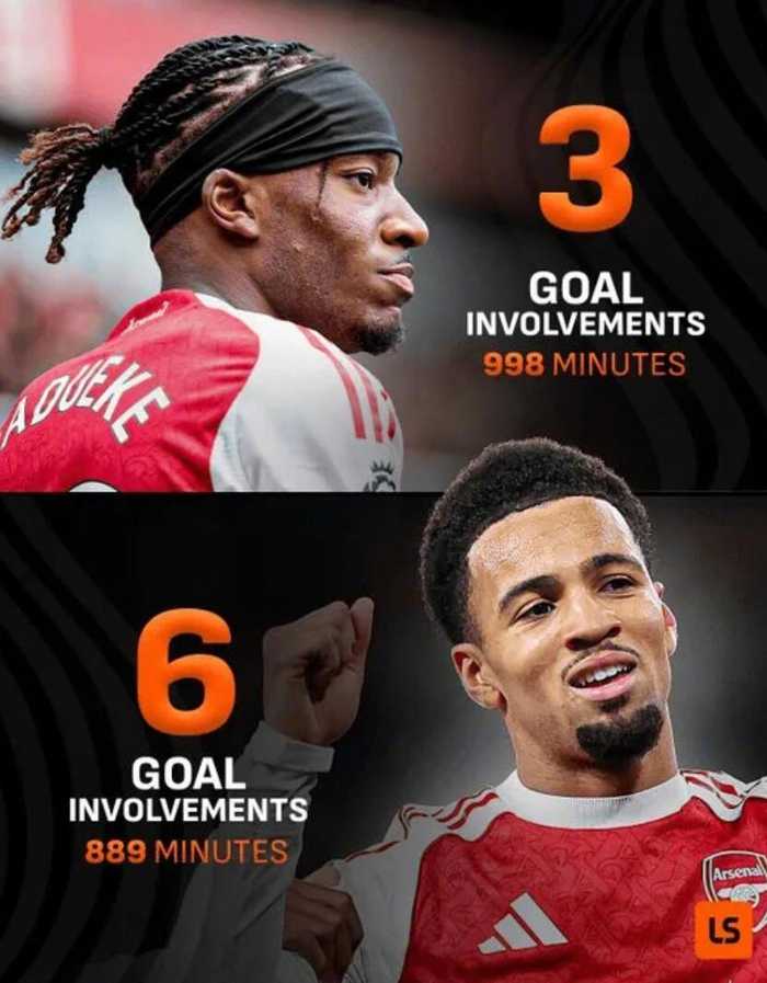 •   livescore发布一张数据对比图,阿森纳边锋马杜埃凯本赛季联赛出场时间达998分钟,但仅直接参与3粒进球。