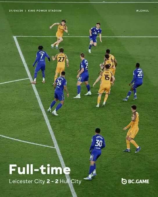 •    英冠第44轮,莱斯特城在主场王权球场2-2战平赫尔城,正式降入英甲。